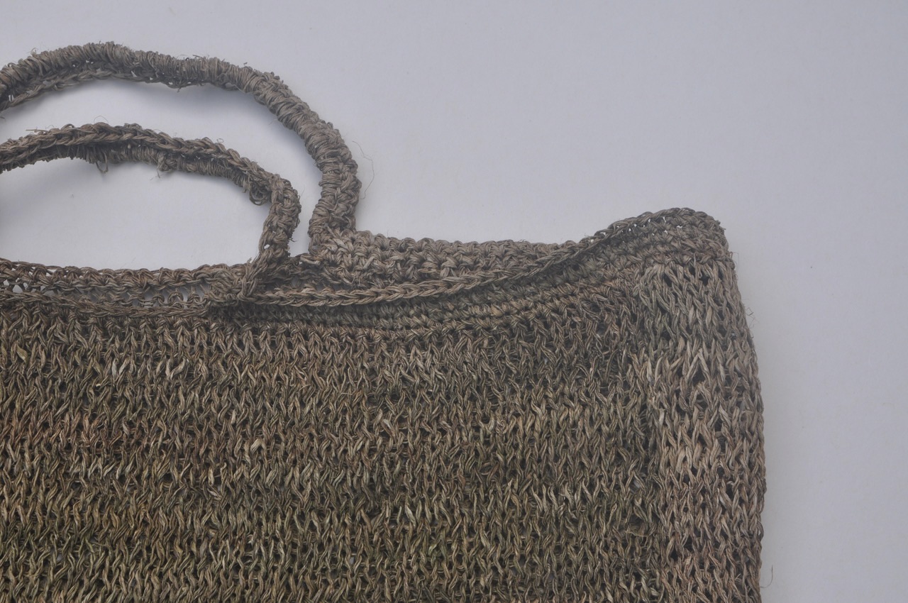 タイのモン族に依頼して制作された、まだ大麻の繊維の青さが残る soma folkの手提げ編みバックです。